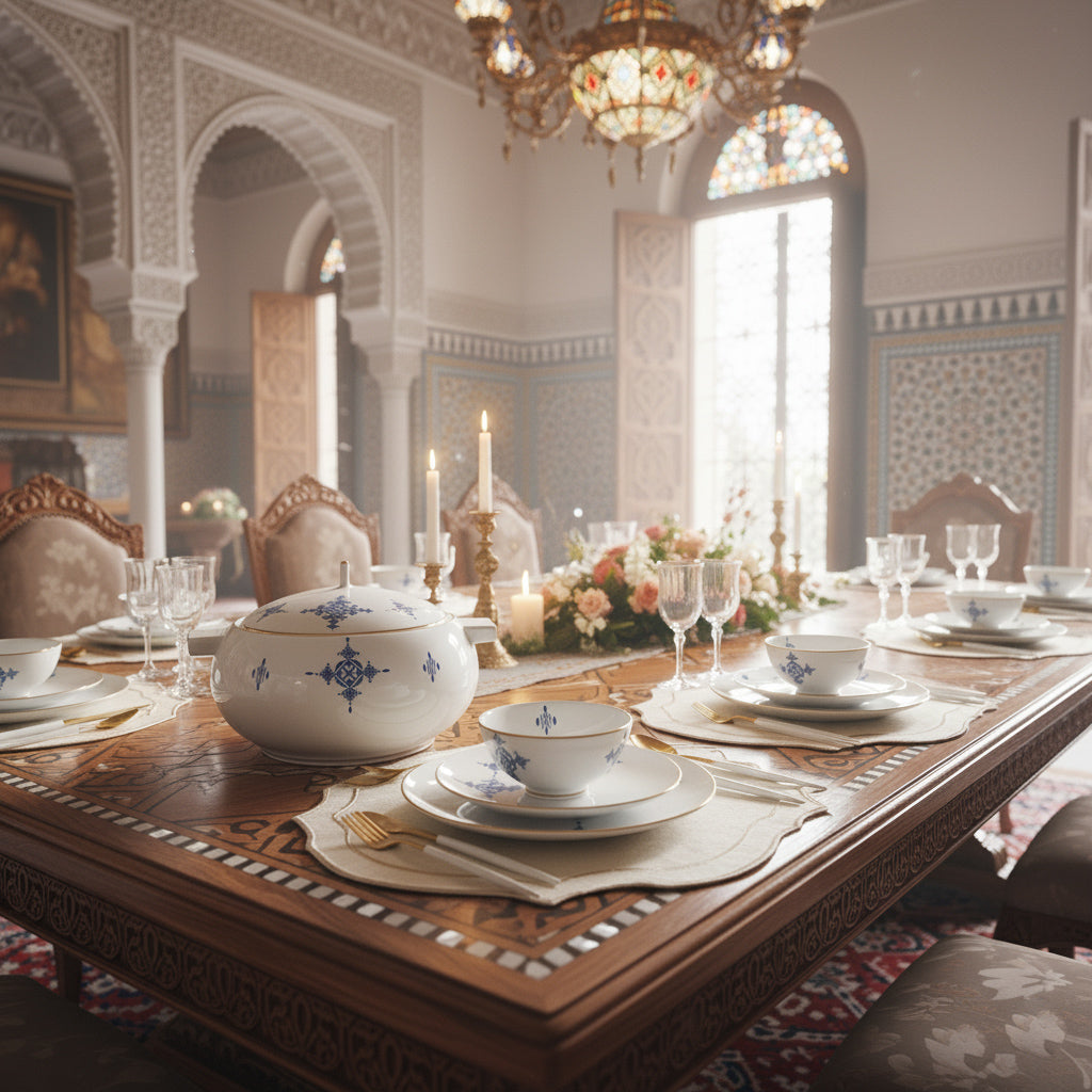 Chaque pièce arbore des motifs géométriques en bleu qui rappellent l'élégance et l'héritage de l'art traditionnel marocain. Avec ses détails dorés raffinés, ce service combine harmonieusement le charme classique avec une touche contemporaine.